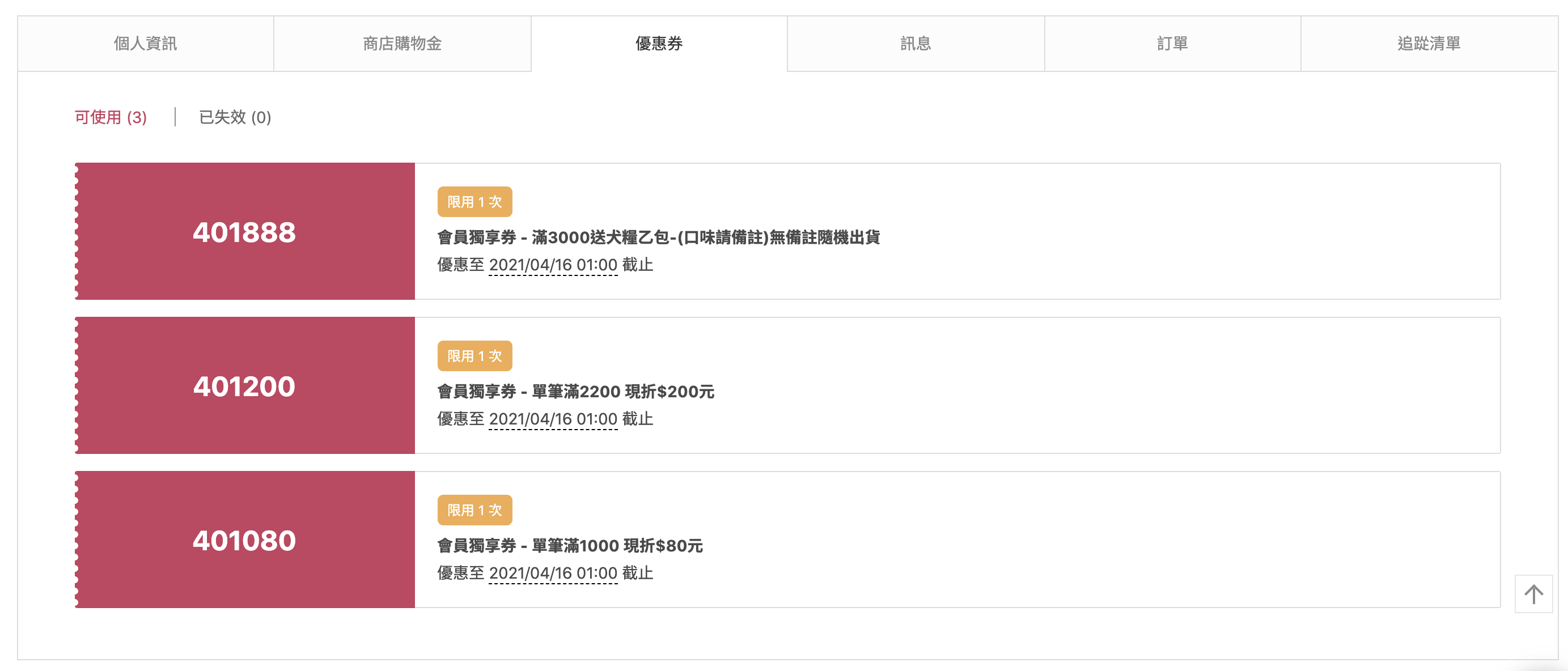 請登入阿寶官網會員,並於會員帳號中尋找「優惠券」項目,每一位寶粉都會有三張優惠券,每張優惠券(限用一次)