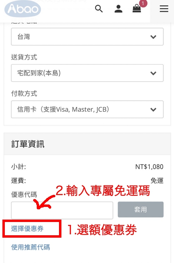 2.點開『選擇優惠券』,輸入專屬免運碼享免運