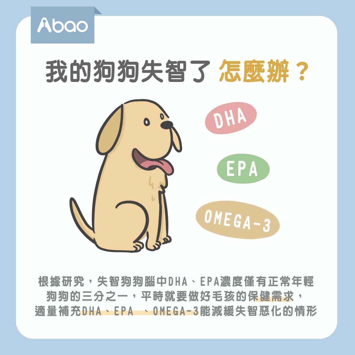 根據研究,失智狗狗腦中DHA、EPA濃度僅有正常年輕狗狗的三分之一,平時就要做好毛孩的保健需求,適量補充DHA、EPA 、OMEGA-3能減緩失智惡化的情形