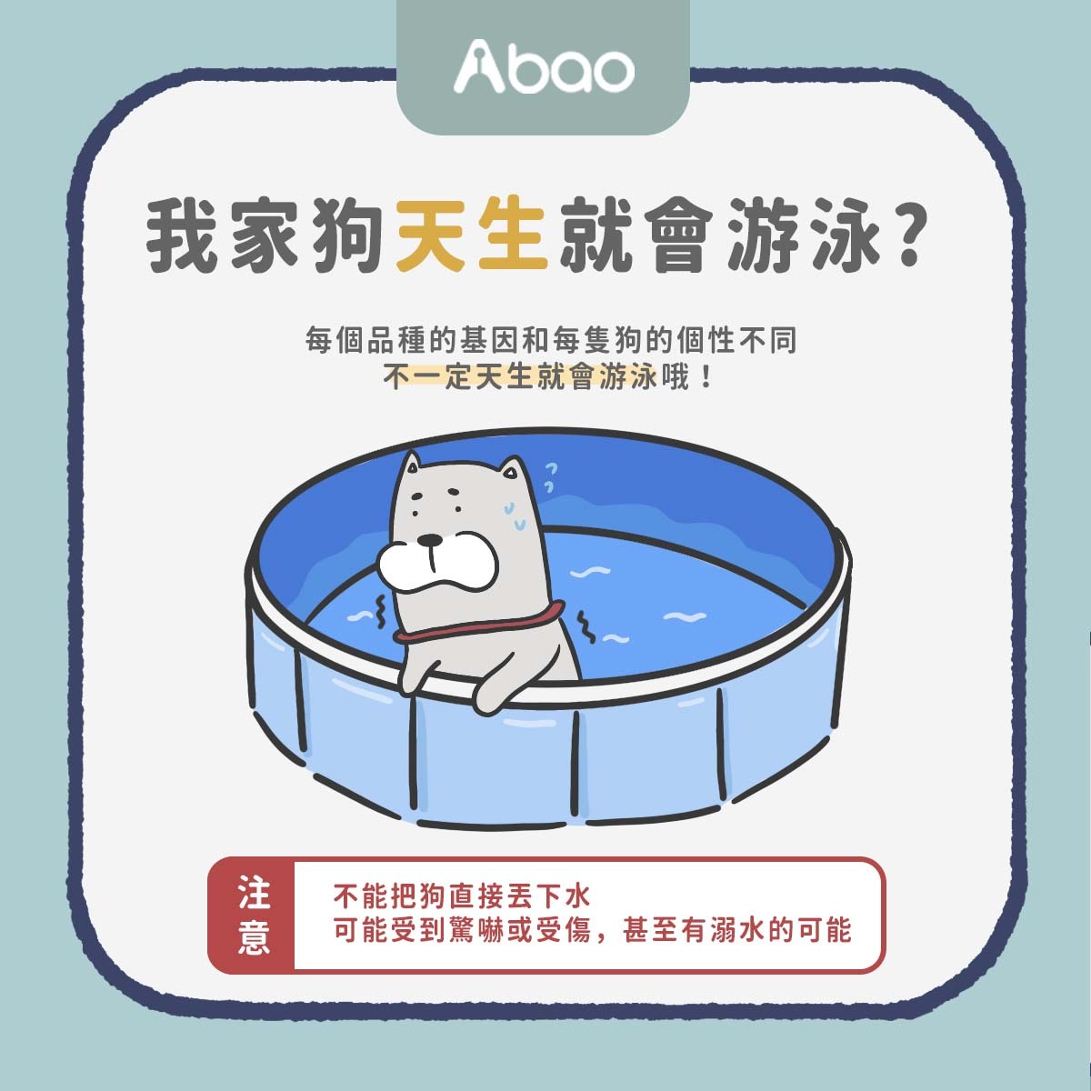 因此絕對要注意不要把狗狗直接丟下水,很可能會受到驚嚇或受傷溺水!