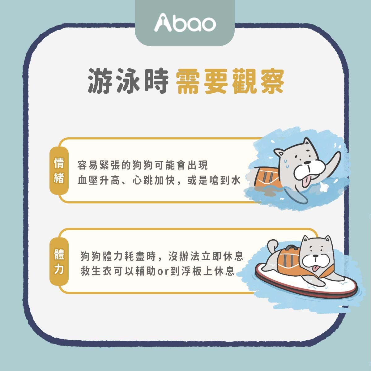 體力:狗狗體力耗盡時若有救生衣則可以輔助,或由飼主帶至浮板上休息