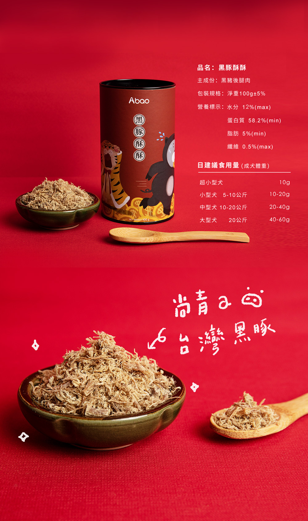 黑豚酥酥:使用台灣在地人食級黑毛豬後腿肉製成、肉質Q彈,營養價值豐富