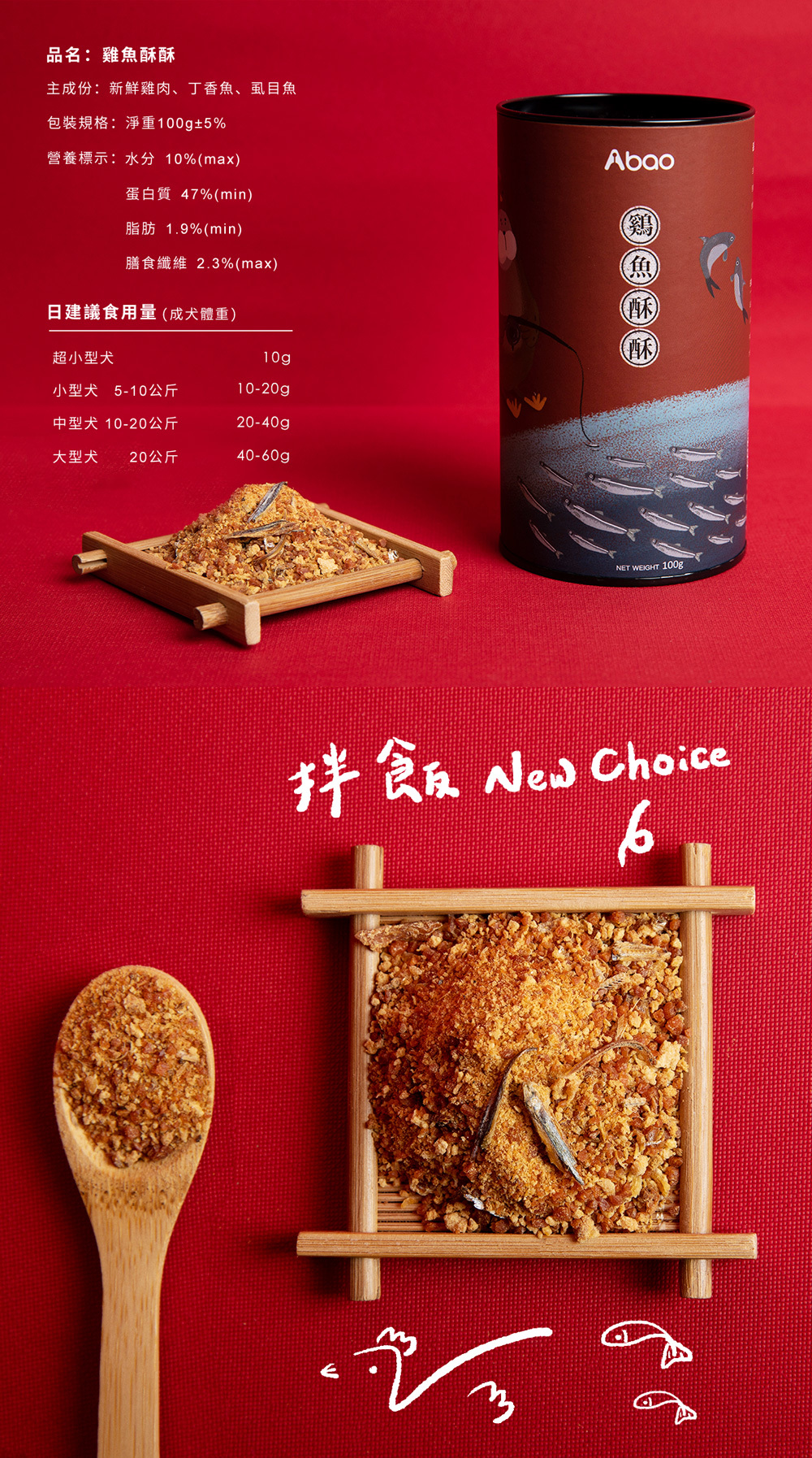 雞魚酥酥:嚴選洽富氣冷雞肉及現撈沙丁魚及虱目魚製成,提供EPA、DHA、補充狗狗所需營養