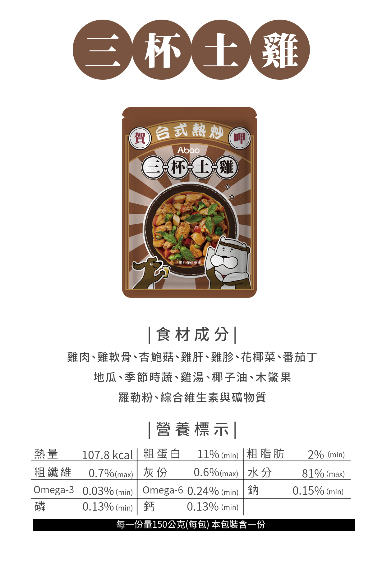 雞肉、雞軟骨、杏鮑菇、雞肝、雞胗、花椰菜、蕃茄丁、地瓜、季節時蔬、雞湯、椰子油、木鱉果、羅勒粉、綜合維生素礦物質