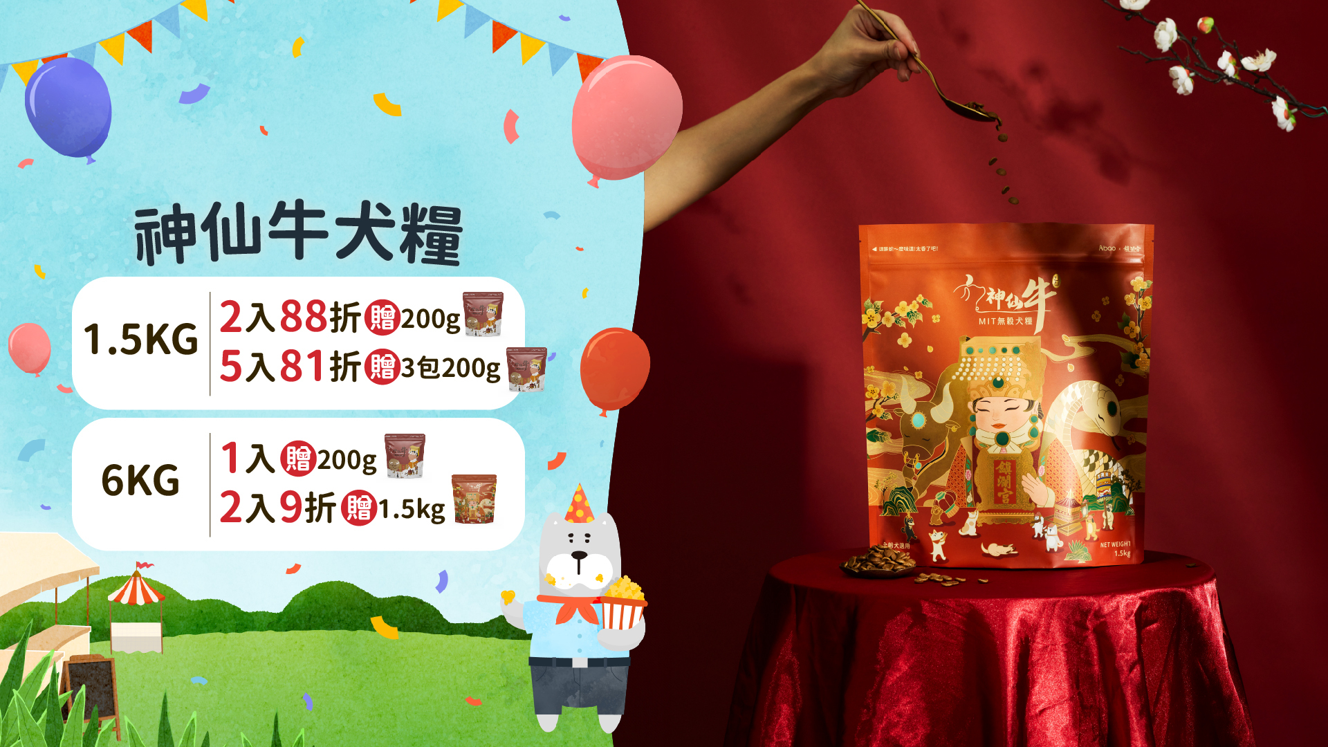 2026-04-20T05:00:00.000+00:00截止 指定商品,【寶の童樂會🍟】神仙牛犬糧𝟏.𝟓𝐊𝐆 | 2入贈200G,5入贈200G*3
