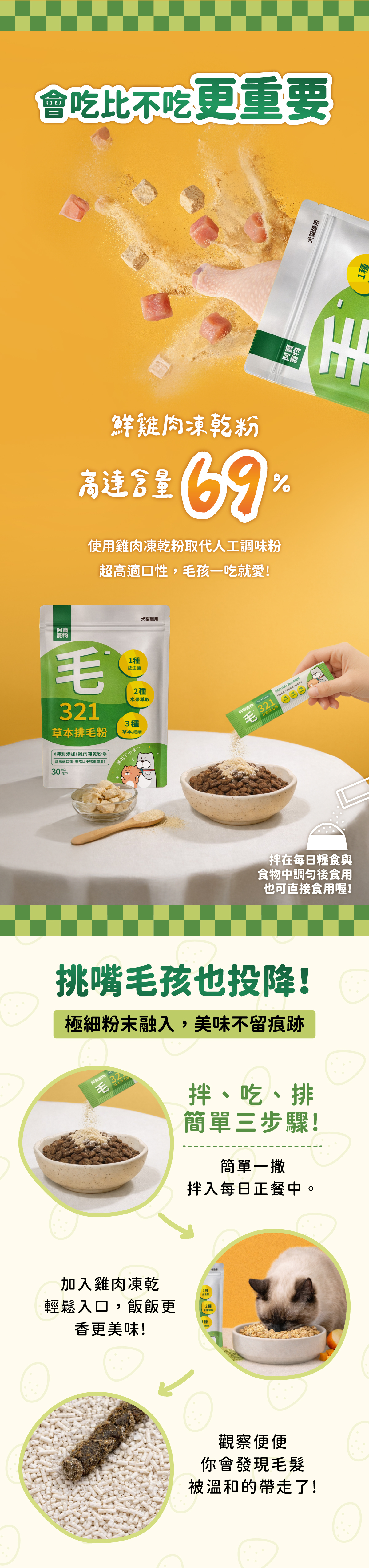 為了讓挑嘴主子也愛上,我們更加入鮮雞肉凍乾粉,完美提升適口性,讓排毛保養變得像吃點心一樣期待!