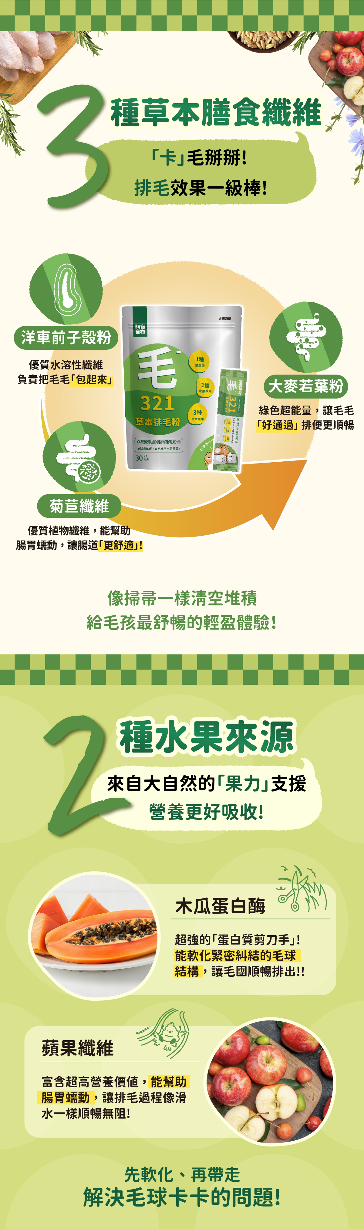 321草本排毛粉 特別添加木瓜蛋白酶三種植物纖維 組合利用植物酵素先行「輔助鬆散」糾結結構,再透過海綿般的纖維溫柔包裹。